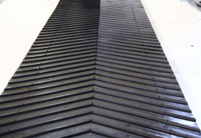 花紋輸送帶是由工作面為花紋狀的覆蓋膠和非工作面為平面的覆蓋膠與帶芯構(gòu)成的傾角輸送帶。帶面上有高于帶體的“人”字型花紋,花紋可是開口也可是封閉的,每一種花紋又可分為高、中、低三種。